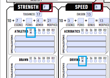 character will have 7 dots filled in under Strength and 3 in Speed).